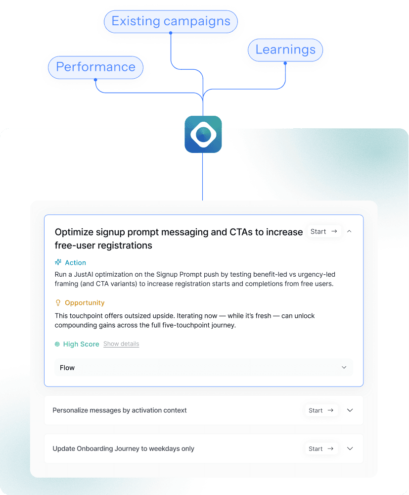 Each opportunity comes with a clear, pre-defined action you can take, like optimizing a message, testing a new angle, or creating a new journey from scratch.